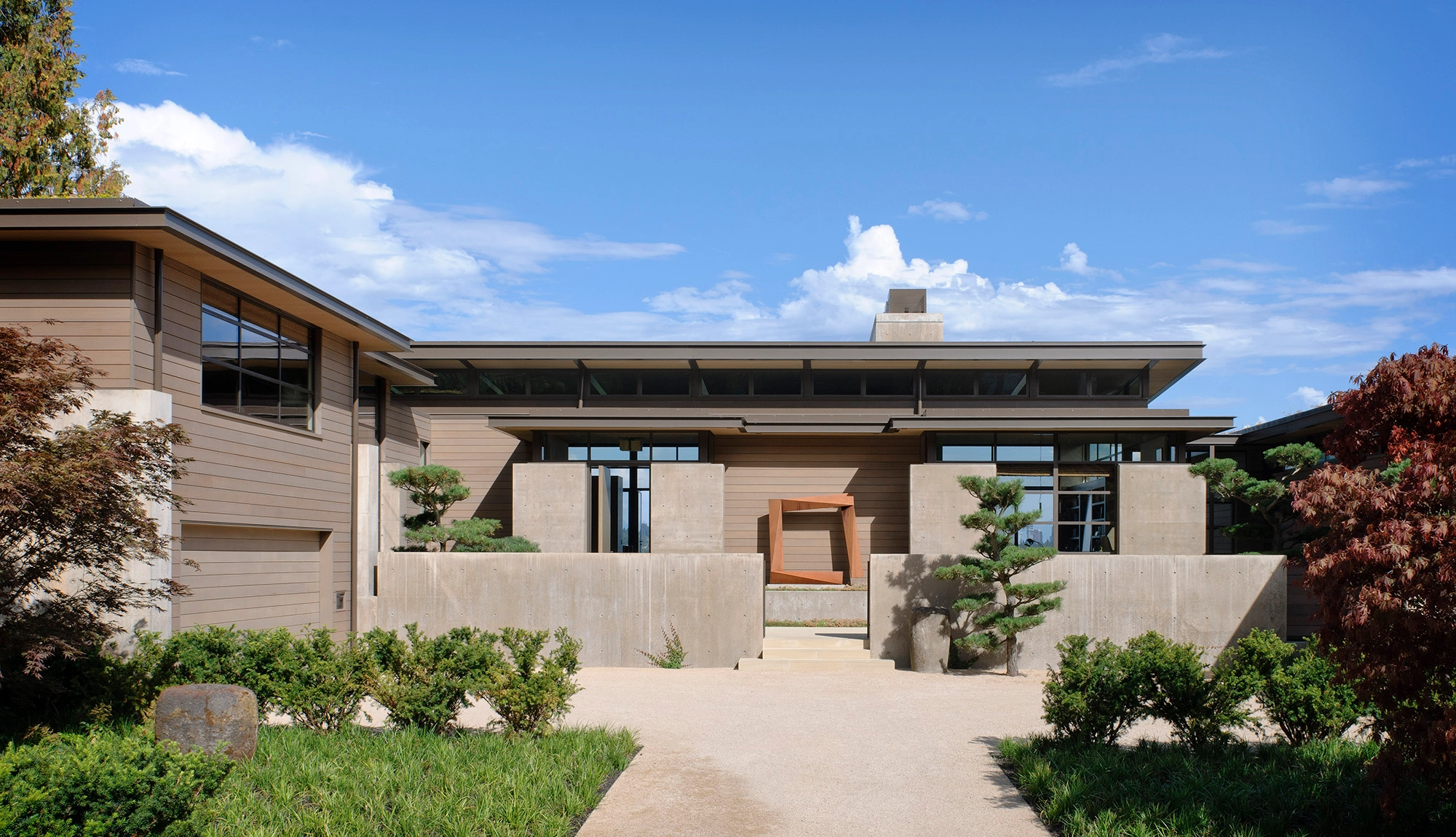 Sandstone-paved terraces link the house to the landscape at both the street side and lake side. Maples and black pines nearly 100 years old serve as living pieces of sculpture along side modern steel sculpture and antique Chinese stone benches. Energy-conscious features include a ground-source heat pump and green roofs.