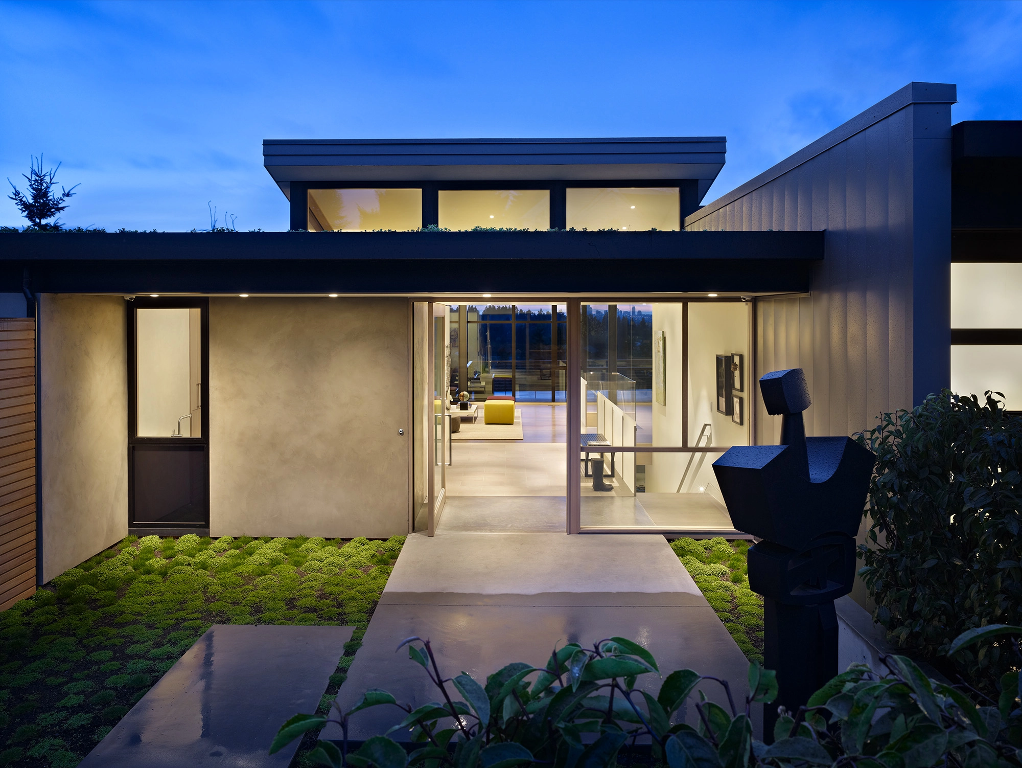 The owners wanted a modern home with timeless materials and expansive light-filled spaces. DeForest Architects designed a solution that required a ground-up remodel of their old home to transform a conventional suburban house into a stunning concrete, steel and glass modern dwelling. A soaring glass window wall with large sliding doors opening out to the elevated deck opens the home to an eagle’s nest view West to the Olympic mountains and Seattle skyline. Despite the floor to ceiling glass the design preserves privacy from neighbors. The home features “switchable” glass at the entry to provide instant privacy or a dramatic view through the house at the touch of a switch. The owners desired reduce the environmental impact of replacing a house so the existing structure was de-constructed to minimize the volume of materials sent to the waste stream, the new home was designed with less space to heat, energy efficient heating and a planted roof.
