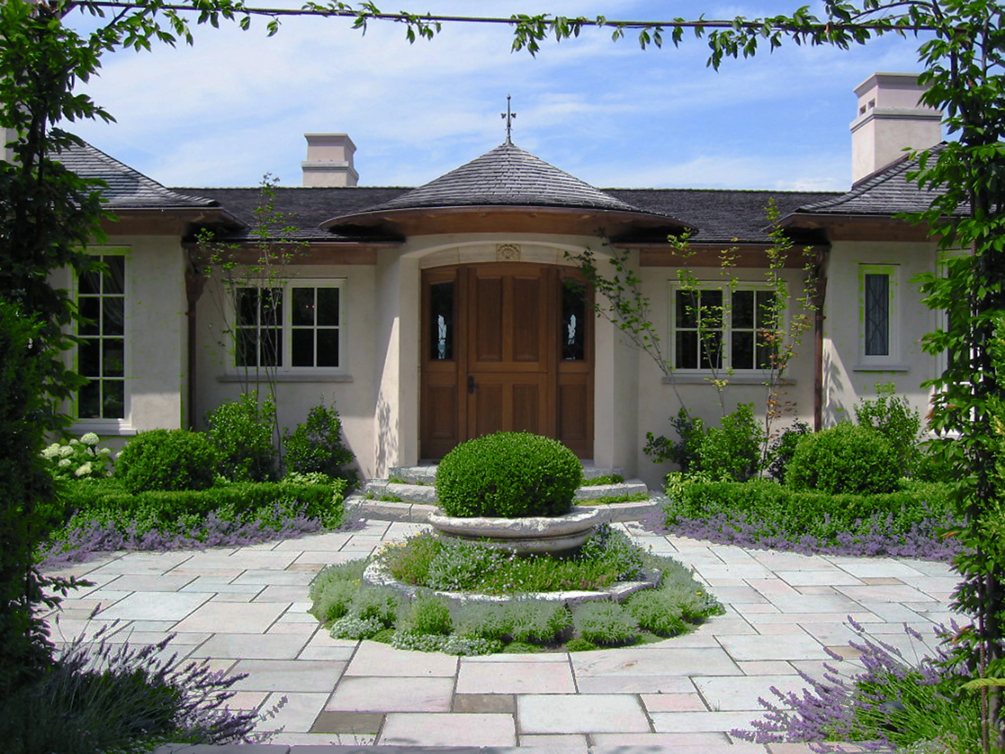 A romantic take on the French country house inspired this home. The centrally placed entry is distinguished by a round tower with a conical roof; extensive interior woodwork and half-timbering in the Norman style used reclaimed chestnut and teak from the East Coast. Stone terracing and pathways link a series of outdoor garden rooms. The challenging site and soil conditions of this waterfront home required an auger-cast piling system, timber-lagged shoring, a shotcrete foundation, and elaborate waterproofing.