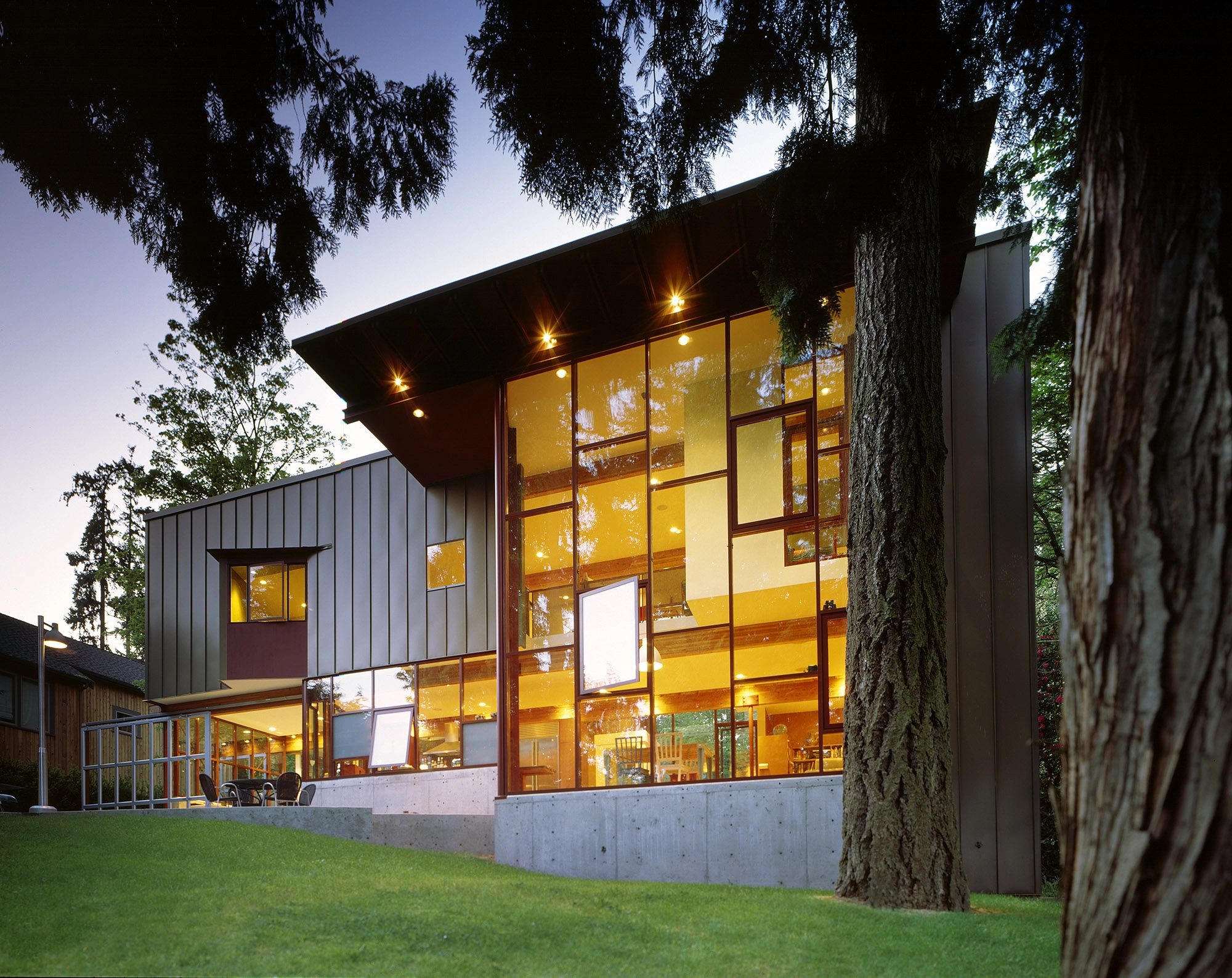 More with less – a new modern home feels expansive in a small footprint. A two-story glass curtain wall dissolves the barrier between the interior and the trees and lake. Metal standing seam roofing panels were chosen to clad the exterior walls – which shimmer as one walks past due to an opalescent copper “pearl” finish over a green base coating.